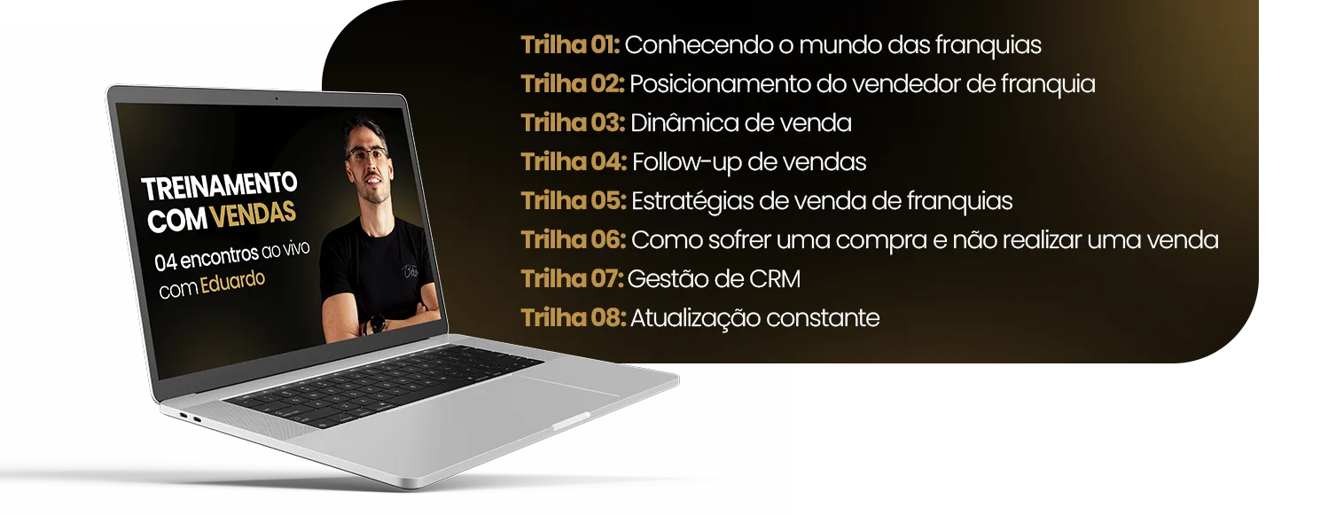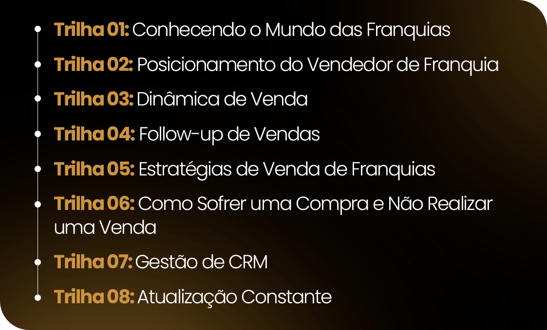 Veja o que espera por você:Este não é apenas um treinamento, é uma transformação na sua forma de vender. Com essas trilhas, você estará preparado para dominar as vendas de franquias e atingir resultados financeiros expressivos.