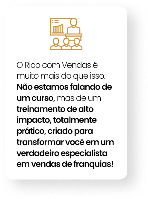 No Rico com Vendas, você vai embarcar em uma jornada completa e prática, onde cada trilha de aprendizado foi projetada para transformar você em um vendedor de alta performance no competitivo mercado de franquias.