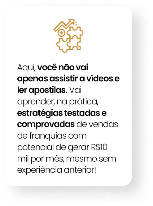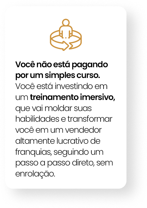 O treinamento de elite, onde você vai aprender o passo a passo para lucrar até R$120 mil por ano vendendo as melhores franquias do mercado.